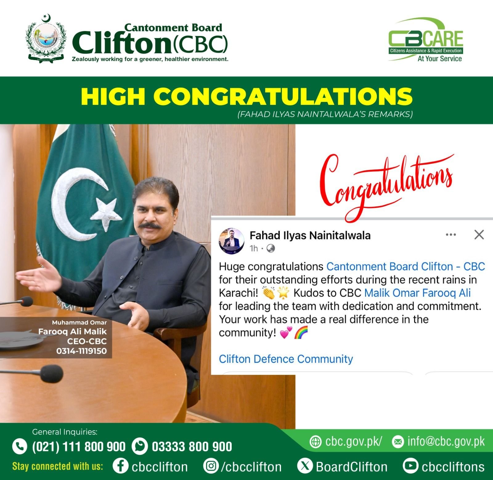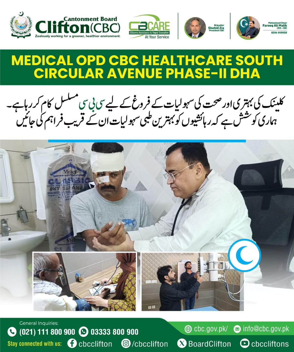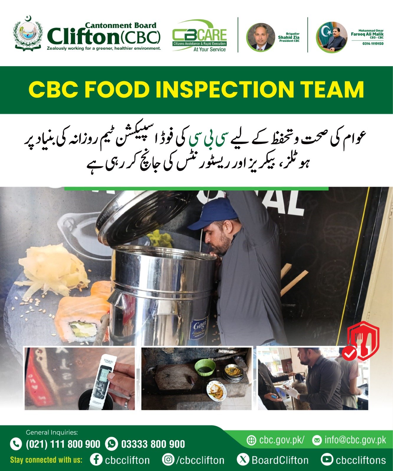 کنٹونمنٹ بورڈ کلفٹن( سی بی سی) کے صدر بریگیڈئیر شاہد ضیاء تمام کاموںکا آوٹ ڈور خود جائزہ لے رہے ہیںاور اپنی ٹیم کو ساتھ ساتھ مزید چیزوںکے بہتری کے لے ہدایت بھی دے رہے ہیں کنٹونمنٹ بورڈ کلفٹن( سی بی