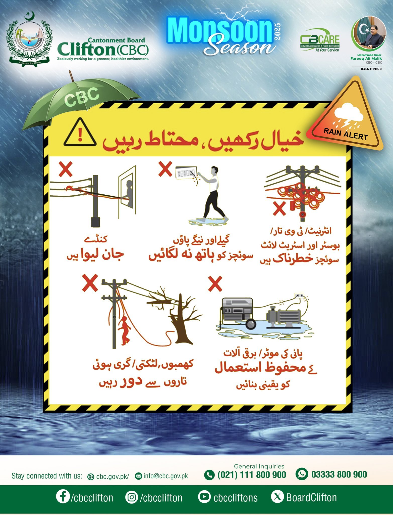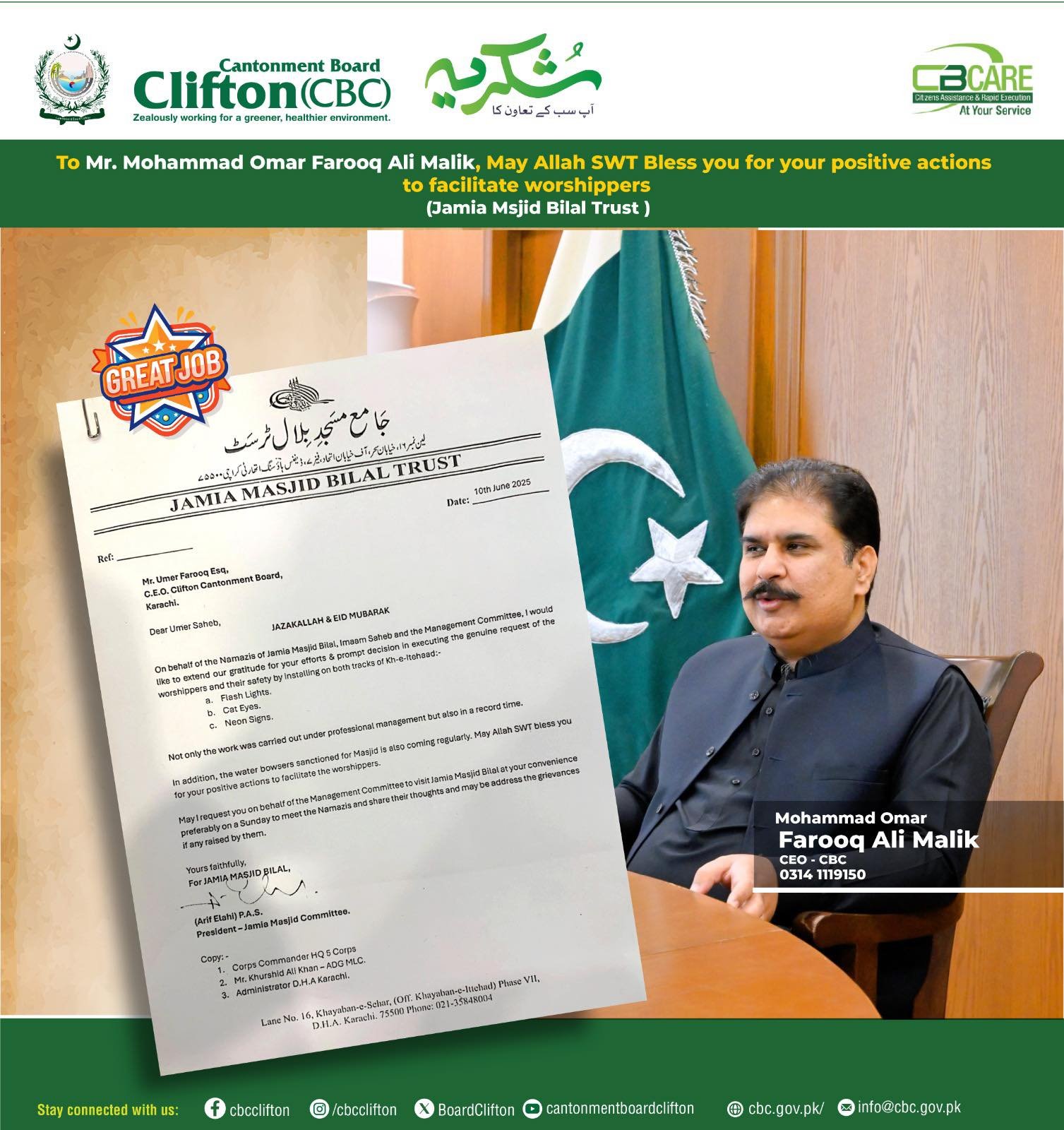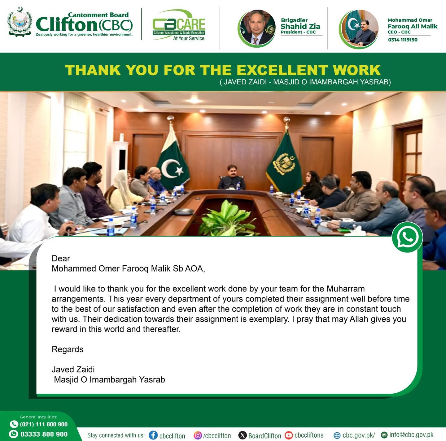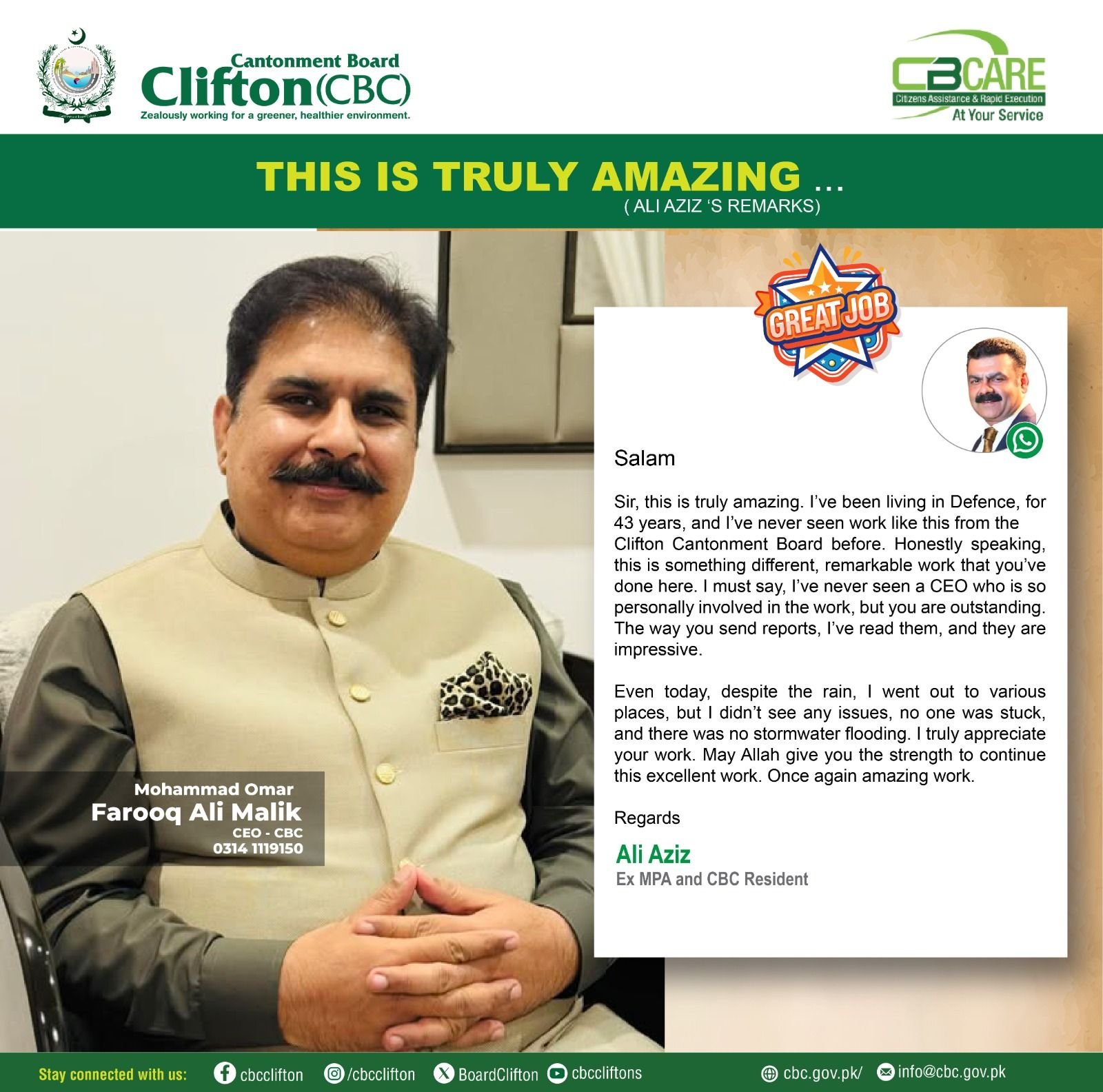 کنٹونمنٹ بورڈ کلفٹن( سی بی سی) کے صدر بریگیڈئیر شاہد ضیاء تمام کاموںکا آوٹ ڈور خود جائزہ لے رہے ہیںاور اپنی ٹیم کو ساتھ ساتھ مزید چیزوںکے بہتری کے لے ہدایت بھی دے رہے ہیں کنٹونمنٹ بورڈ کلفٹن( سی بی